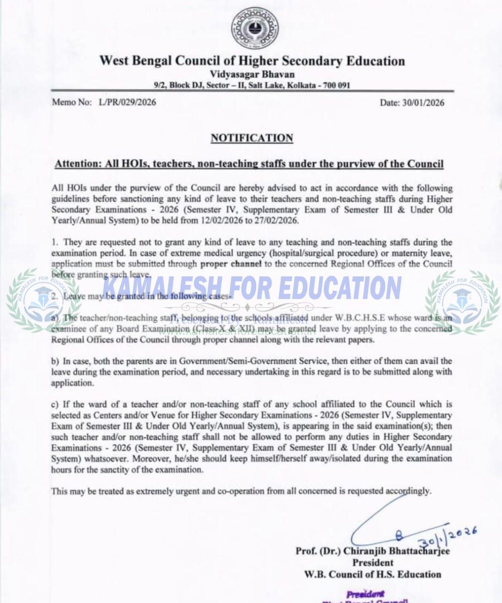 আসন্ন উচ্চমাধ্যমিক চতুর্থ সেমিস্টার ও বিগত তৃতীয় সেমিস্টার এর সাপ্লিমেন্টারি পরীক্ষার চলার সময় শিক্ষক শিক্ষিকা ও শিক্ষাকর্মীদের ছুটি নেওয়ার পদ্ধতি নিয়ে গাইডলাইন প্রকাশ করল উচ্চ মাধ্যমিক শিক্ষা সংসদ তাদের মেমো নং – L/PR/029/2026, তারিখ- 30/01/2026 দ্বারা।