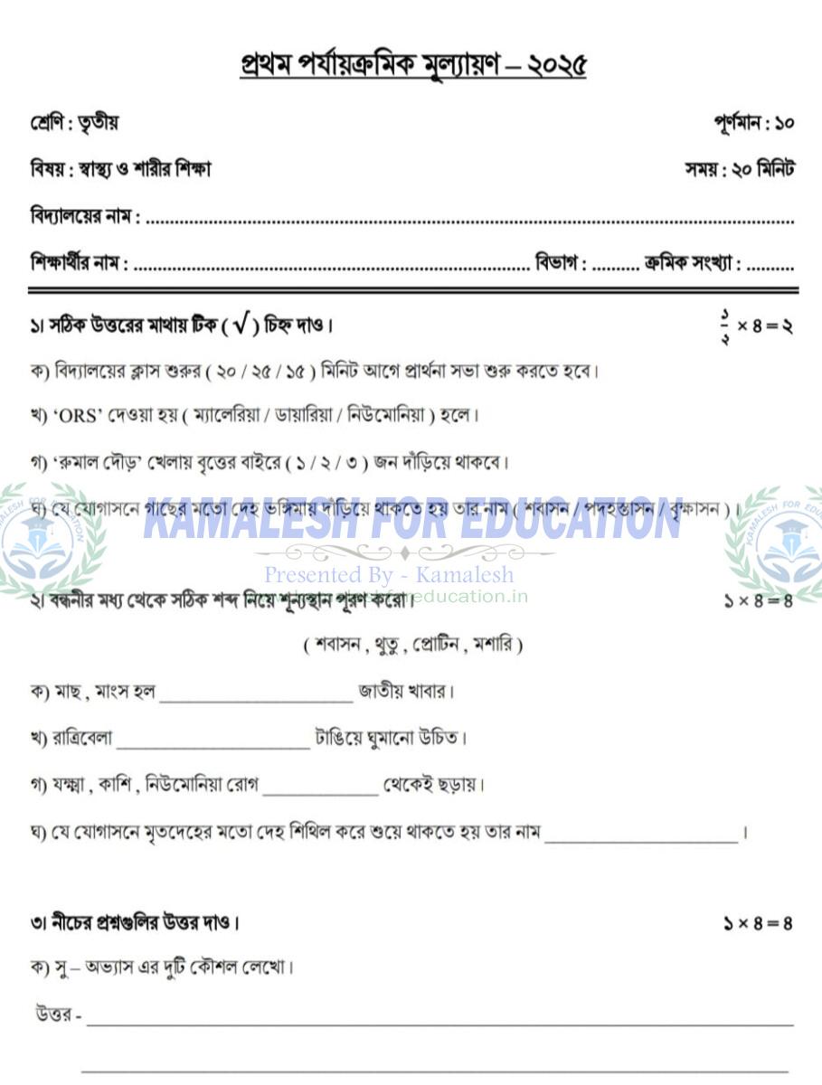 তৃতীয় শ্রেণি প্রথম পর্যায় ক্রমিক মূল্যায়ন স্বাস্থ্য ও শারীর শিক্ষা ২০২৫ ©kamaleshforeducation.in(2023) Share this: Click to share on Facebook (Opens in new window) Facebook Click to share on X (Opens in new window) X Like this:Like Loading... Related