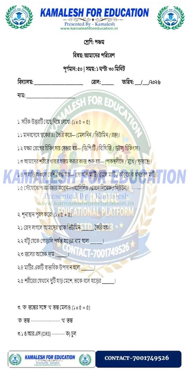 ***পঞ্চম শ্রেণি প্রথম ইউনিট টেস্ট-আমাদের পরিবেশ*** ============================================================================================== ©kamaleshforeducation.in(2023) Share this: Click to share on Facebook (Opens in new window) Facebook Click to share on X (Opens in new window) X Like this:Like Loading... Related