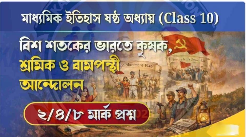 মাধ্যমিক ইতিহাসের ষষ্ঠ অধ্যায় ‘বিশ শতকের ভারতে কৃষক, শ্রমিক ও বামপন্থী আন্দোলন’(History Chapter 6) এর মধ্যে ভারতের স্বাধীনতা সংগ্রামে সাধারণ কৃষক, মেহনতি শ্রমিক শ্রেণি এবং বামপন্থী দলগুলোর শক্তিশালী ভূমিকা, কিংবা বারদোলি ও তেভাগা আন্দোলনের মতো ঐতিহাসিক ঘটনাগুলো এই অংশে দারুণভাবে বিশ্লেষণ করা হয়েছে। আজকের পোস্টে এই চ্যাপ্টার থেকে বাছাই করা ২, ৪ এবং ৮ নম্বরের গুরুত্বপূর্ণ প্রশ্ন ও উত্তরগুলো শেয়ার করা হল।